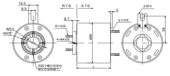 緊定螺絲固定。定子部分通過(guò)止轉(zhuǎn)片與設(shè)備固定部位連接。 |